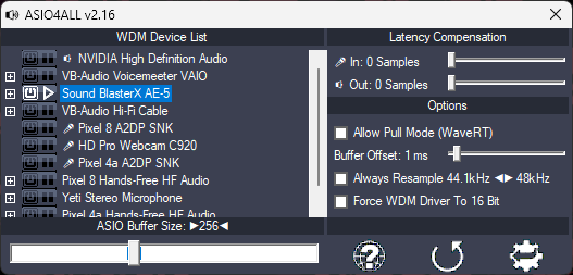 - Select the gear button (bottom right), and ensure Latency Compensation is set to 0 samples (both in and out) for the active device.