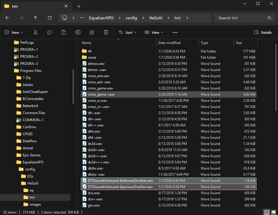 Step 10: Open up Explorer, and navigate to where you have HeSuVi installed (usually C:\Program Files\EqualizerAPO\config\HeSuVi). Copy the downloaded HRIR .wav files into the hrir folder.