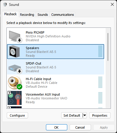 Step 7: Under the playback tab, you should see your available audio outputs. Hi-Fi Cable Input should be the default output device, if not already. Selecting your actual audio output (not Hi-Fi), click on properties: